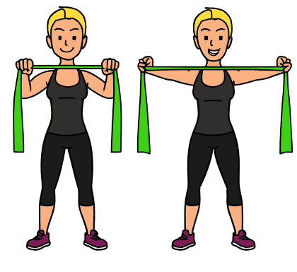 Pull the band outwards by squeezing your shoulder blades together, and until it touches your chest and your hands are in line with your body.
